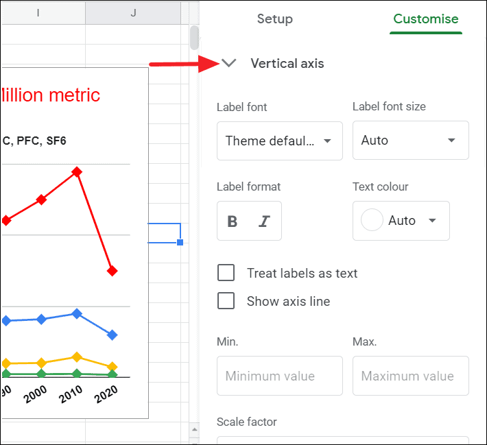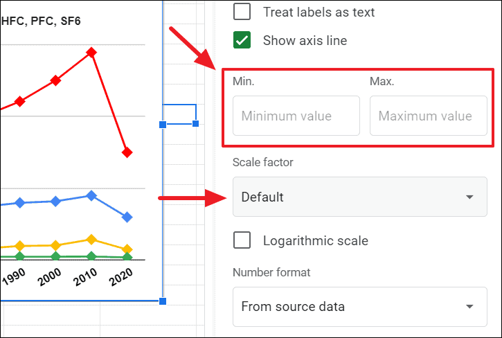 You can set maximum and minimum bounds for the y-axis with the ‘Min.’ and ‘Max.’ fields. If you have large-scale values like in millions or billions, you can change those values into decimals with the ‘Scale factor’ drop-down.
