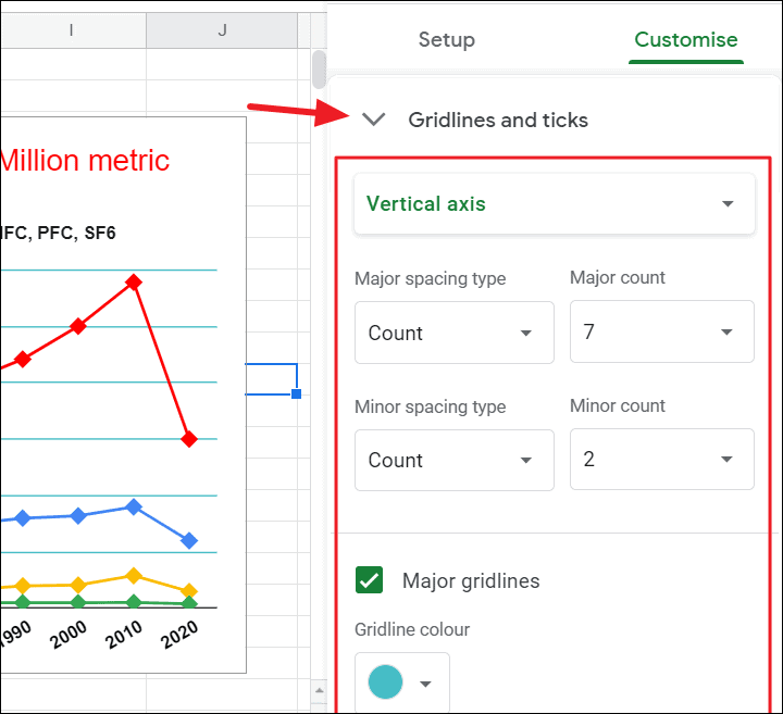 In the Gridlines and ticks section of Chart Editor, you can format the gridlines and ticks in the line chart. You can change the number and color of major and minor gridlines in the graph.