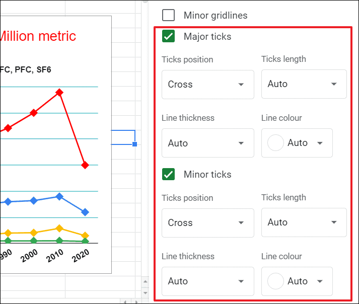 Google Sheets allows you to add major and minor gridlines and ticks to your chart.