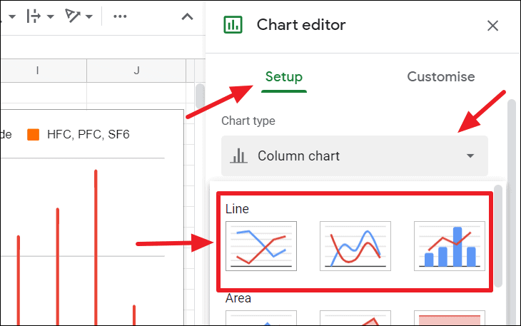 To change the chart type, go to the ‘Setup’ tab in the Chart editor pane, click on the ‘Chart type’ drop-down menu and select one of the three-line chart types. This would change the existing chart into a line chart.