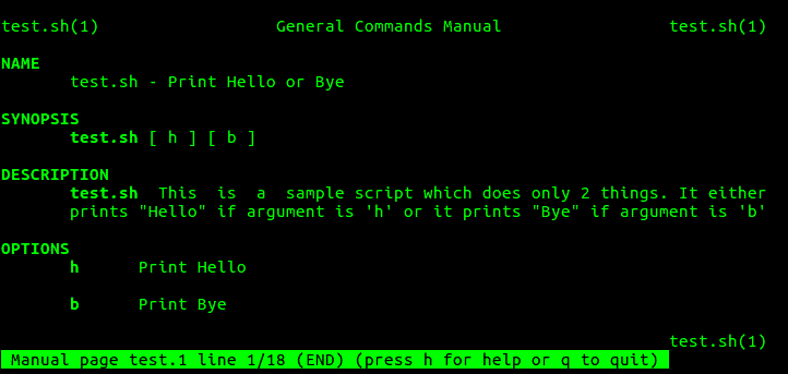 This is a sample script which does only 2 things. It either prints "Hello" if argument is 'h' or it prints "Bye" if argument is 'b'