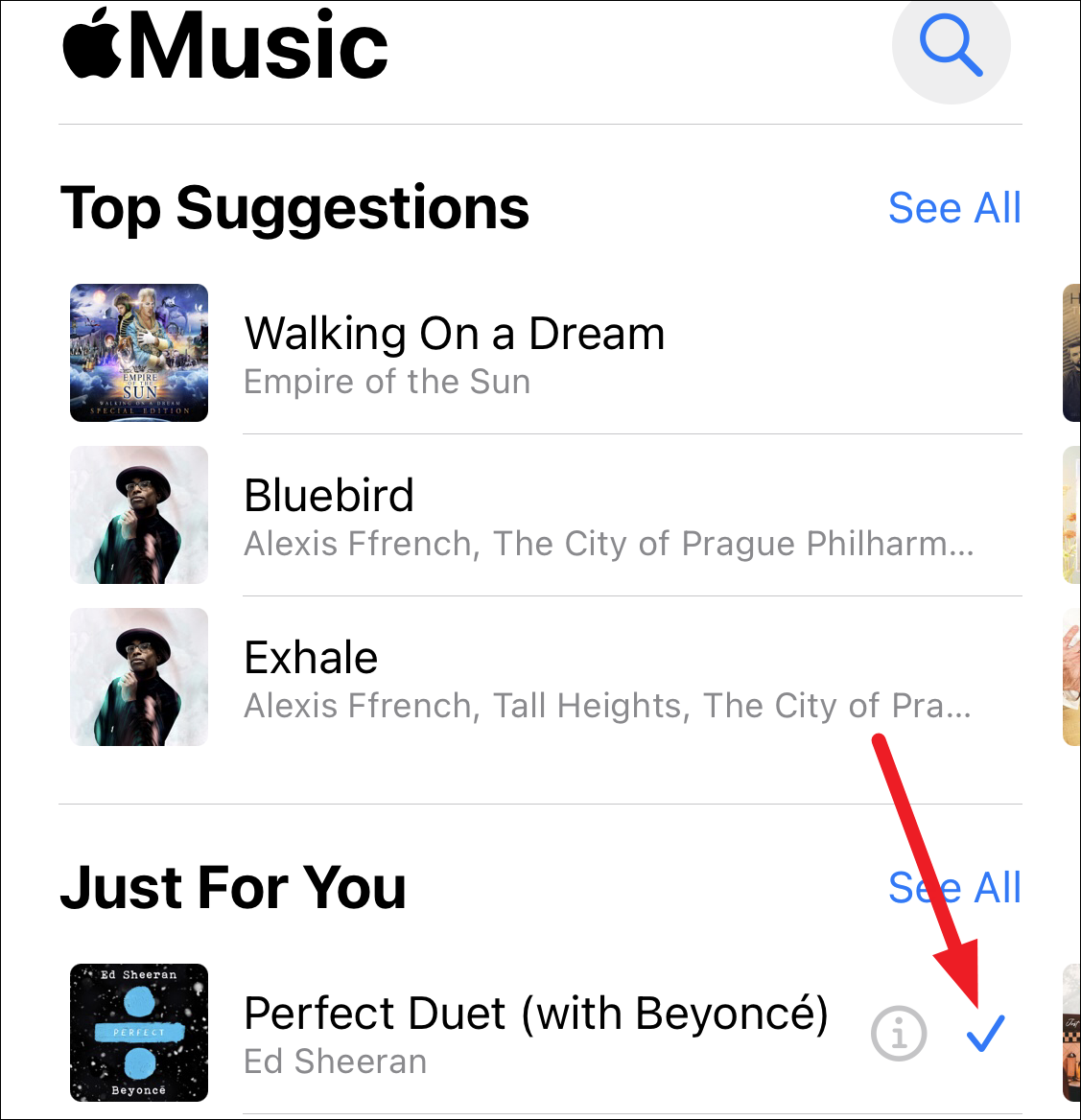 Select a song from the suggestions on your screen or search for a song. Tap the song to select it; it’ll start playing. If you don’t want to choose it, tap ‘Cancel’ and choose another song. Otherwise, tap ‘Done’.