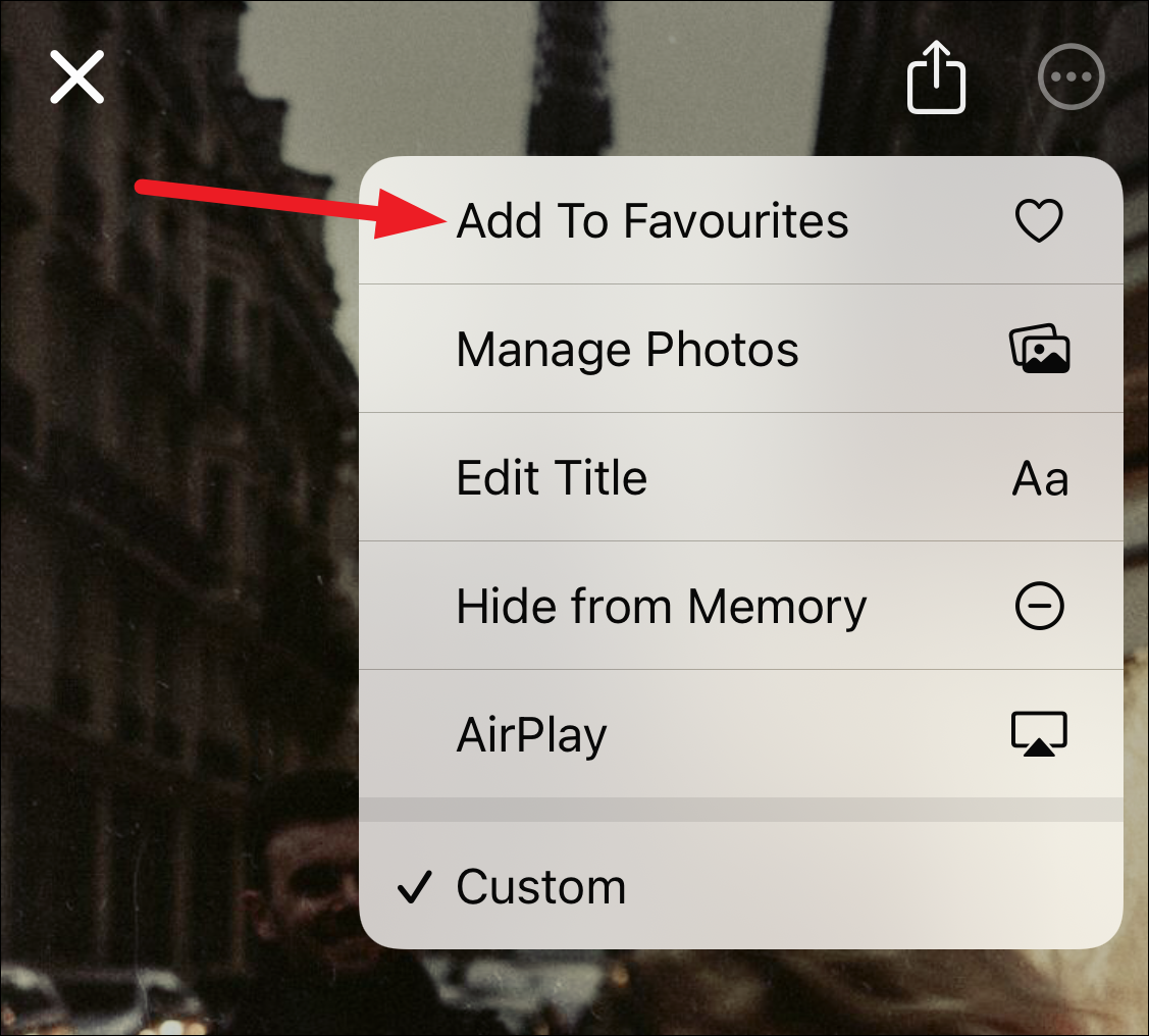 If you want to save the memory, tap the screen to bring up options. Then, tap the ‘More’ option (three-dot menu) in the top-right corner of the screen. Tap ‘Add to Favorites’ from the menu. The memory will appear in the Memories section of the ‘For You’ tab.