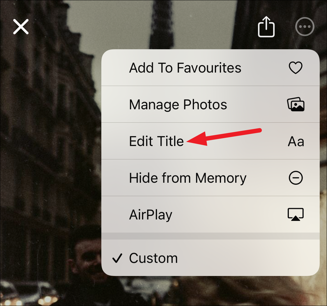 iPhone names your memories randomly, sometimes according to the location, day, album or person’s name, or any context it can see, like “Celebration.” But you can change the name. To edit the name of the memory, open the memory and tap it to bring up options. Tap the ‘More’ button (three-dot menu) in the upper-right corner.