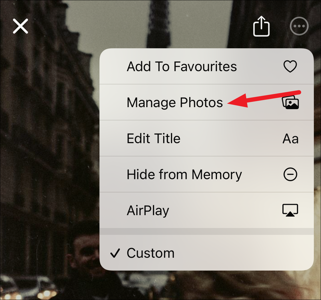 Go to the album or day/ month from the library and tap the ‘More’ icon (three-dot menu) in the top-right corner.