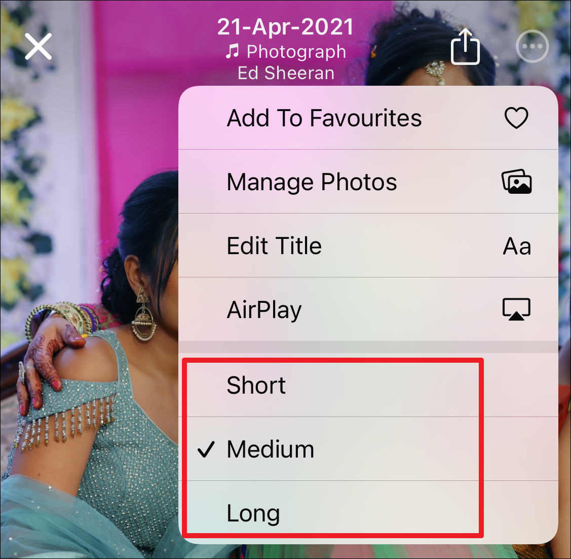 There, you’ll most likely see the three options: ‘Short’, ‘Medium’ and ‘Long’. Tap the option you want to. For some memories, you might only see ‘Short’ and ‘Medium’ depending on the number of photos you have for them.