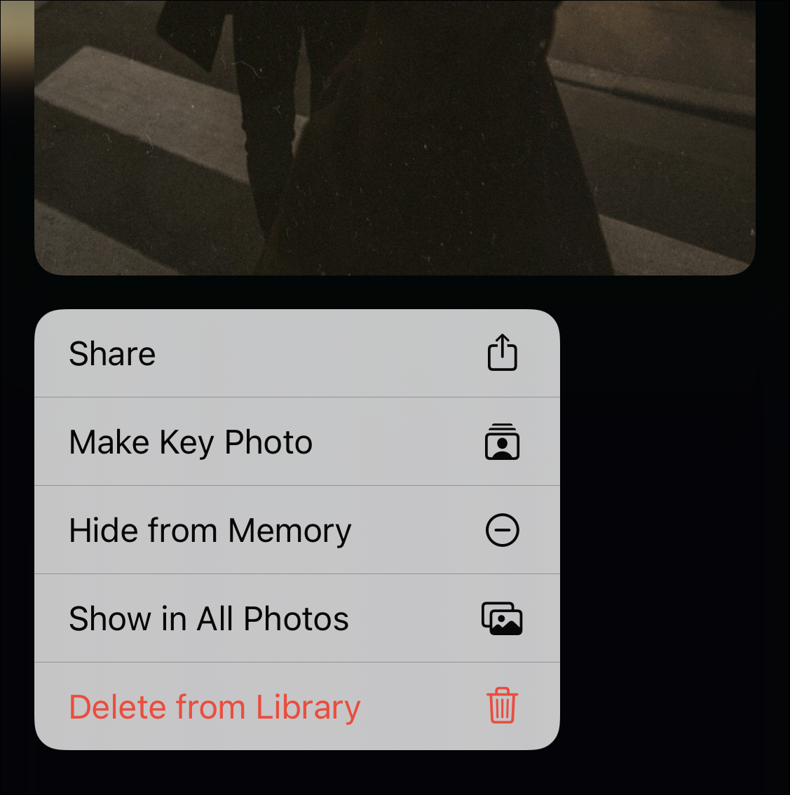 You can hold and tap a photo to bring up options like removing the photo from the memory, deleting it altogether from the library, making it the key photo, among others. If you simply tap a photo, you’ll return to that photo being played in the memory slideshow.