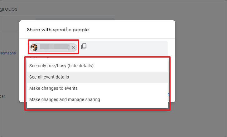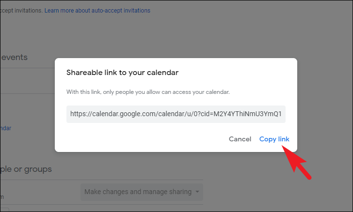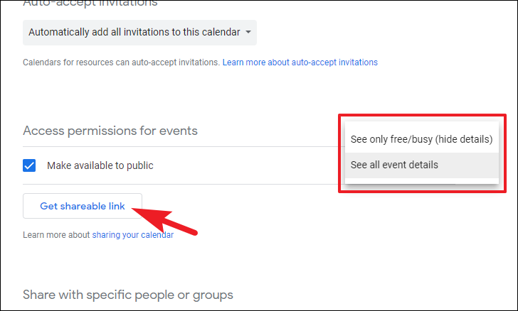 While making your calendar public, you can choose whether you want all details about the event to be visible, or only when you’re free/ busy, i.e., the event details will be hidden. Click on the dropdown menu and select the desired option from ‘See all details’ or ‘See only free/ busy’. In case you want to share the calendar via a link, click on the ‘Get a shareable link’ button. This will bring an overlay window to your screen.