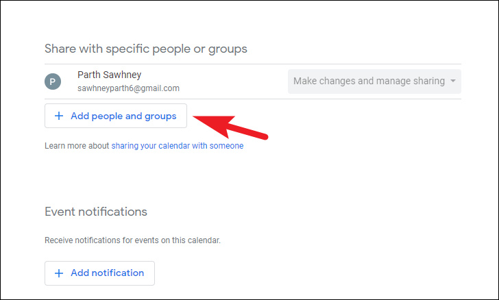 If you want to share the calendar with a group of people, click on the ‘Add people and groups’ button. This will bring an overlay window to your screen.