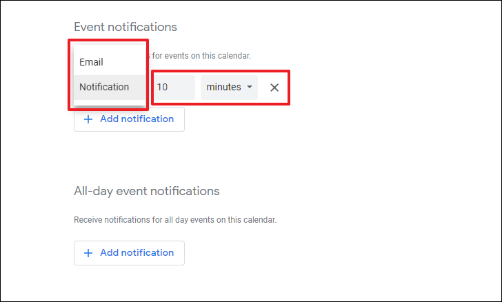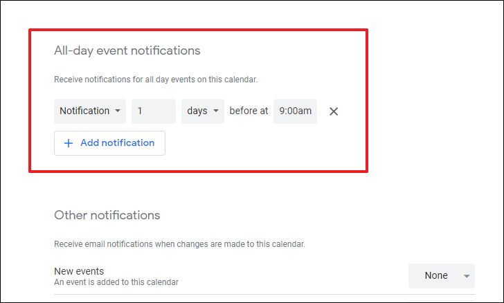 If you wish to receive a notification for an all-day event, you can repeat the above-mentioned process in the ‘All-day event notifications’ section.