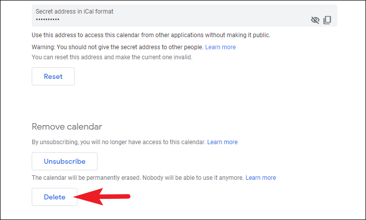 To delete the calendar, scroll down to the bottom of the page and click on the ‘Delete’ button.