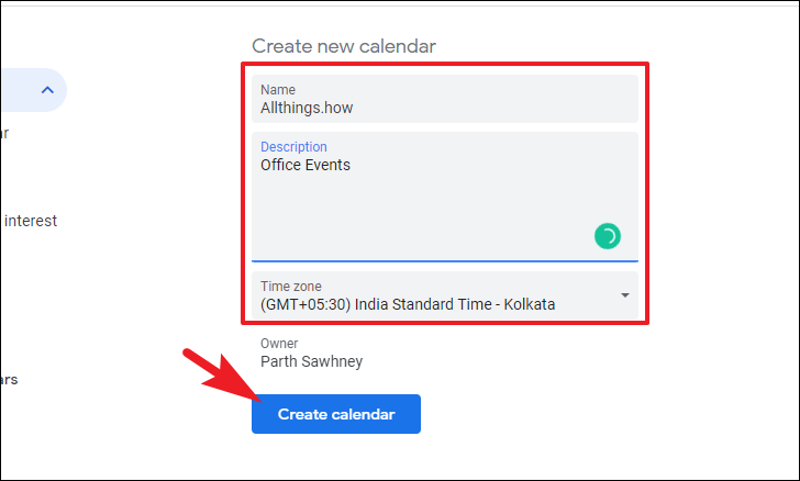 On the next screen, provide an appropriate name for the Calendar along with a description of it. Then, select a time zone for the Calendar. Finally, click on the ‘Create calendar’ button to proceed.