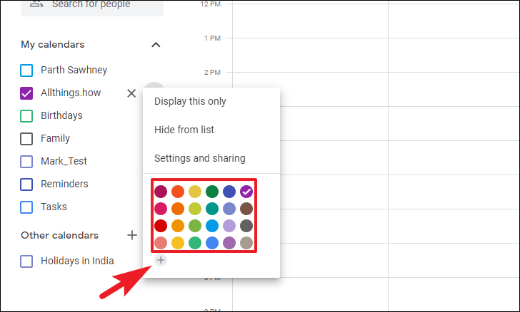 Then, choose a present color from the grid. Otherwise, click on the ‘+’ icon to add a custom color for the calendar. This will bring an overlay window to your screen where you can choose the custom color.