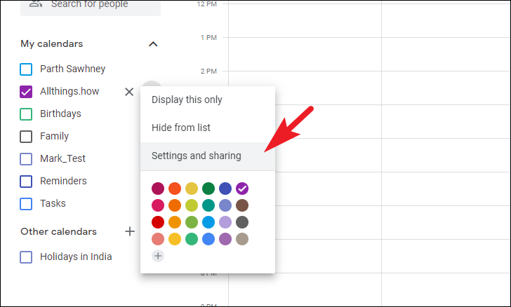 To edit a calendar, hover over the calendar listing under the ‘My Calendars’ section in the left sidebar. Then, click on the ‘Settings and sharing’ option to continue.