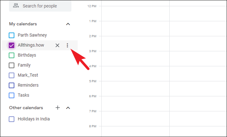To change the calendar color, hover over the calendar listing under the ‘My Calendars’ section in the left sidebar. Next, click on the ‘kebab menu’ icon.