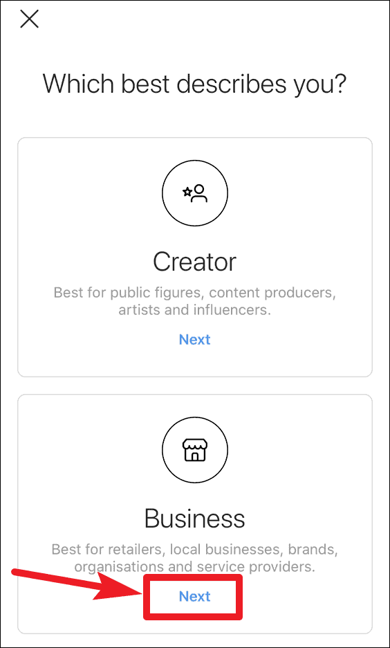 Step 7: You will be presented with two options: Creator and Business. Select Business if you're setting up an account for a company or brand, then tap Next.