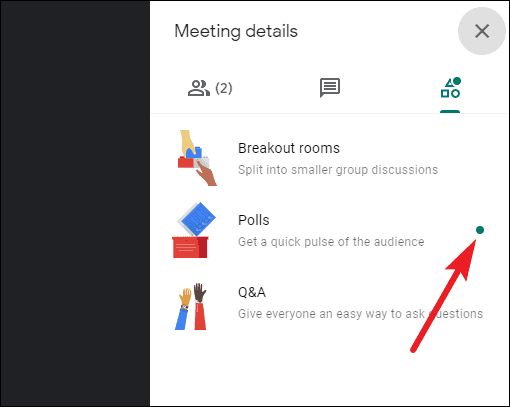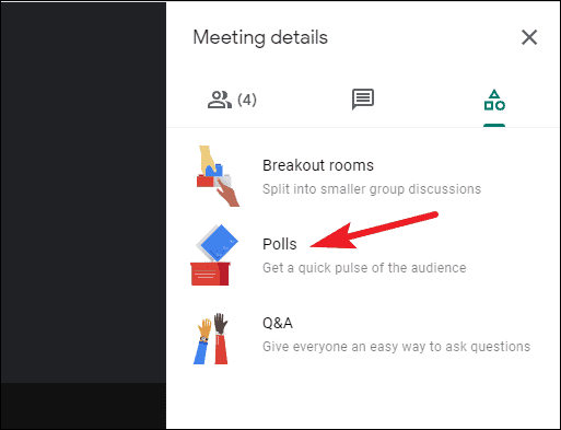 The meeting details panel will appear on the right with the activities tab open. Click the ‘Polls’ option.