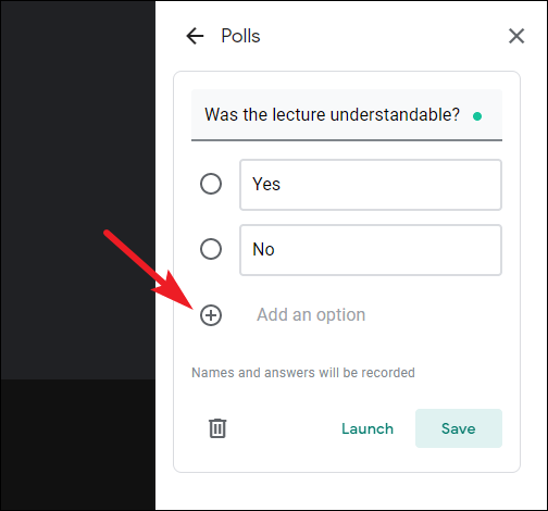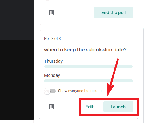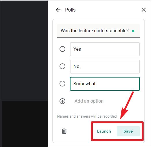 Now, you can either launch the poll right away or save it for later. Click the ‘Launch’ button, and all eligible participants will be able to see and respond to the poll. Click the ‘Save’ button to launch it later.