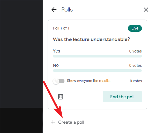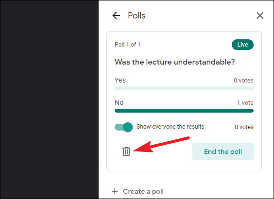 After you end the poll, participants will no longer be able to submit a vote. But they’ll still be able to see the poll. Click the ‘Delete’ button to delete it.