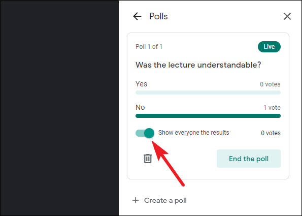 Once you launch the poll, you can manage or moderate it from the same panel. You can also see the responses to the poll from here. Initially, only you can see the results of the poll. To share the results with participants at the end or anytime during the poll, turn on the toggle for ‘Share results with everyone’. You can turn it off at any time.