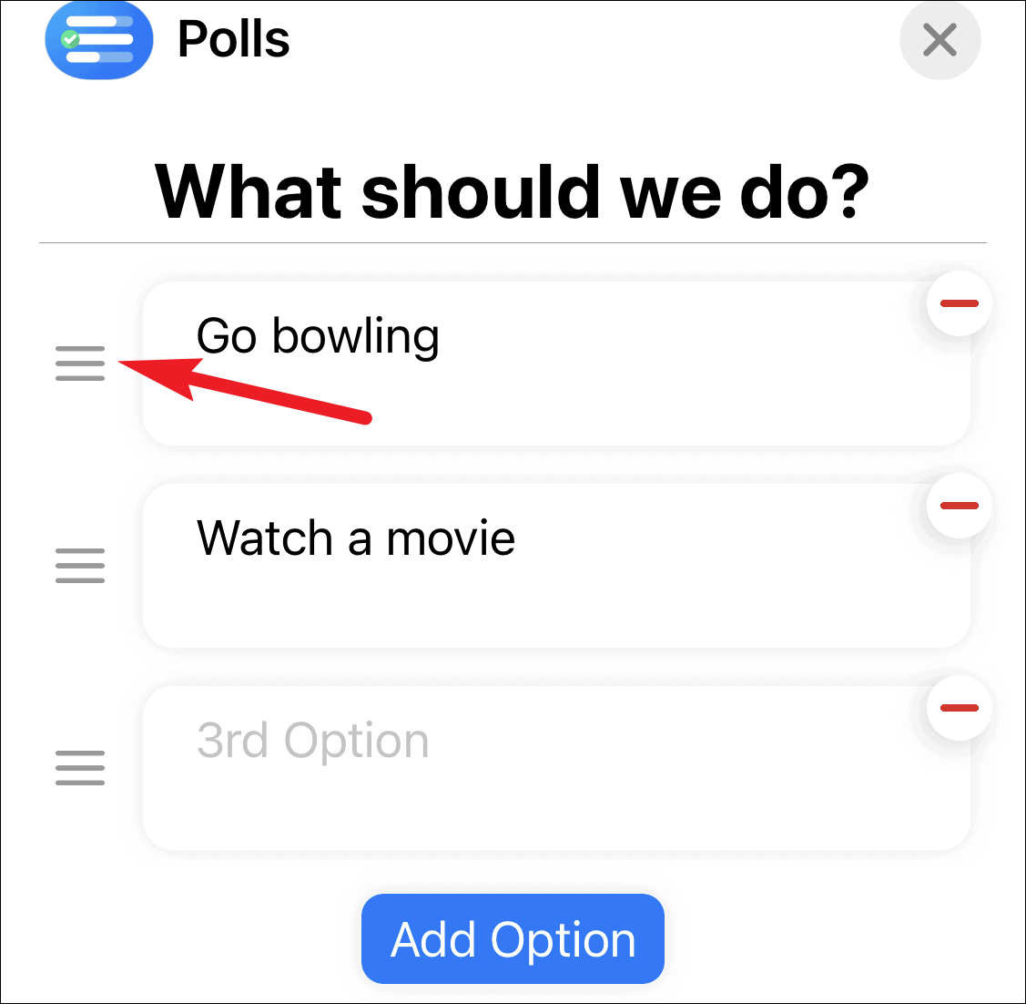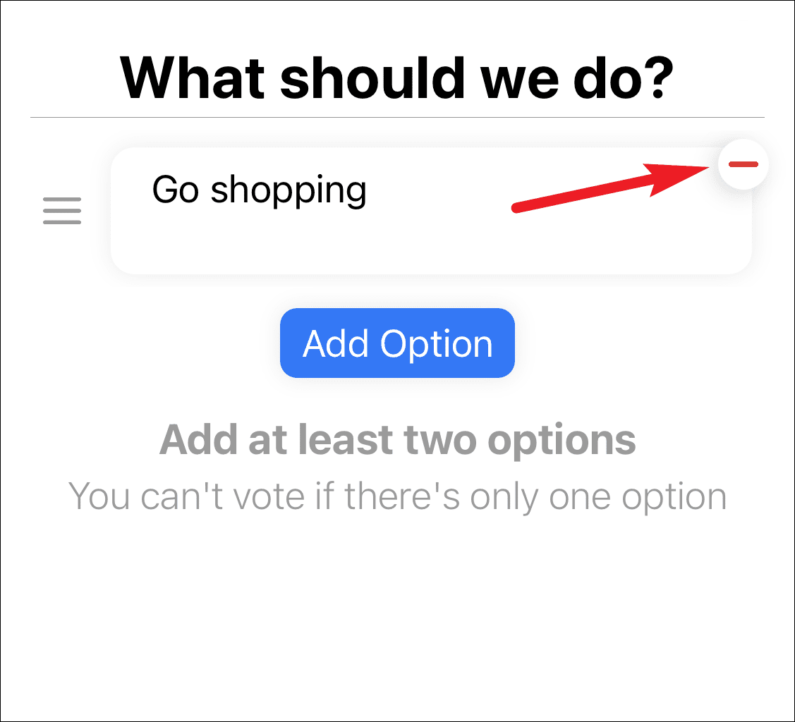 Step 4: Add options for your poll by tapping 'Add Option'. You can include at least two options, but there's no limit to how many you can add. Options can be text, links, or dates and times.