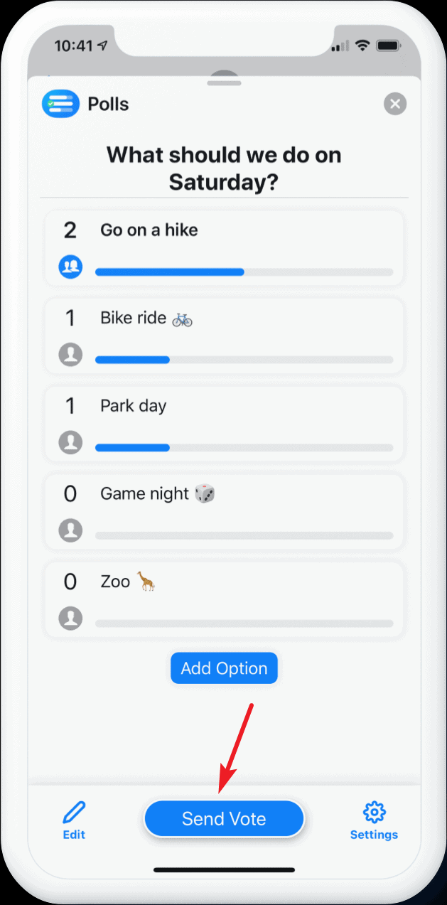 Step 1: To vote in a poll, participants need to have the Polls for iMessage app installed. When they tap on the poll within the conversation, the app interface will open.