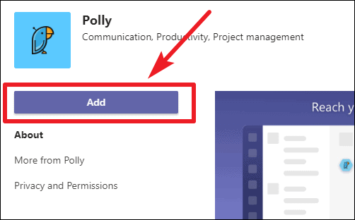 Step 2: Search for Polly in the apps list and click the Add button to install it for your account. This will allow you to create polls using Polly within Teams.