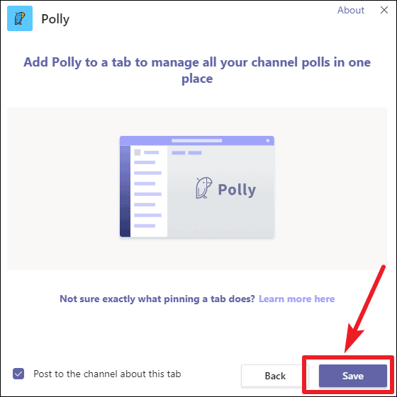 Step 4: Search for Polly in the tab gallery and click Add. Then, click Save to confirm adding it as a tab.