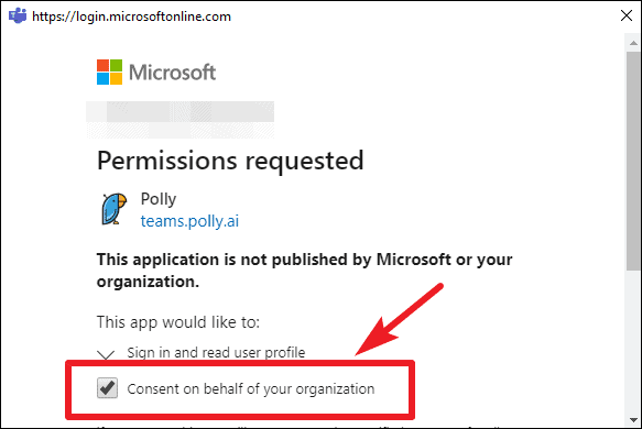 Step 5: Sign in to Polly with your Microsoft account and grant the necessary permissions. If you're the organization owner, you can consent on behalf of all users.