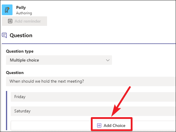 Step 8: Enter your poll question and at least two answer choices. You can add more options by clicking Add Choice. Adjust the settings for anonymity and result visibility according to your preferences. Click Preview when you're ready.