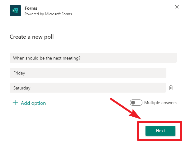 Step 3: In the Forms window, enter your poll question and options. To add more choices, click Add Option. If you want respondents to select multiple answers, toggle on Multiple Answers. Click Next when you're done.