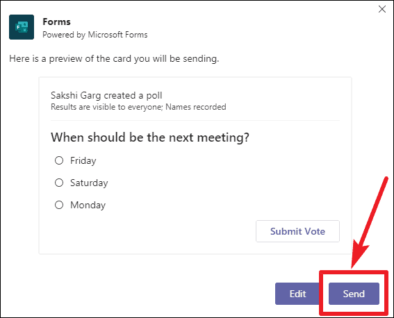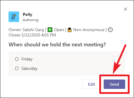 Step 4: Preview your poll. If you need to make changes, click Edit. Otherwise, click Send to post the poll to the channel or chat.
