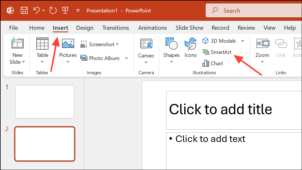 Step 1: Select the slide where you want to insert your radial list. Go to the Insert tab, then click SmartArt in the Illustrations section. This opens the SmartArt Graphic gallery.