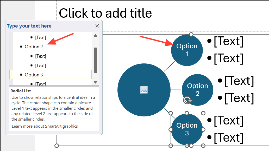 Step 3: Enter your central idea in the main (center) shape. Add your list items in the surrounding circles. You can do this by clicking directly into each shape or using the text pane that appears to the left of the SmartArt graphic.