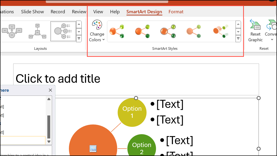 None, then overlay your own text or shape. - Convert the SmartArt to shapes by right-clicking and choosing