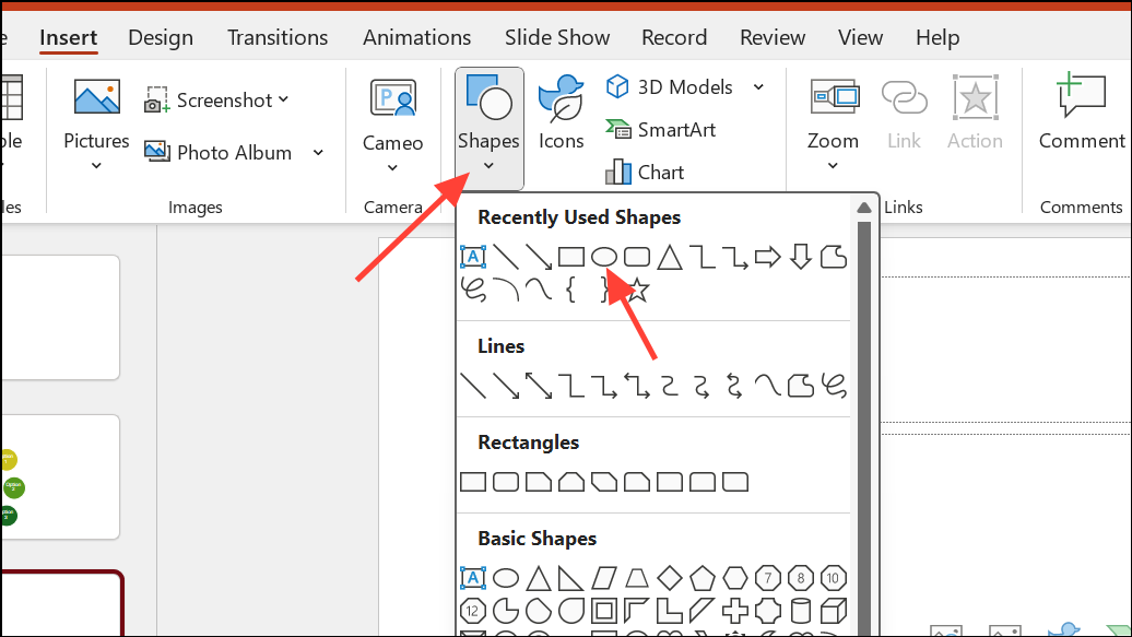 Step 1: Insert a blank slide and go to the Insert tab. Choose Shapes, then select Oval for the central item. Hold Shift while dragging to create a perfect circle.