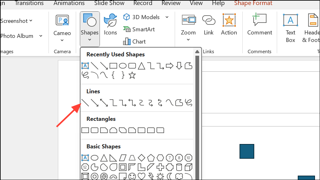 Step 4: Draw connecting lines from the central circle to each outer item. Go to Insert > Shapes > Line or Connector. Hold Shift for straight lines. Attach one end to the center and the other to a list item shape.