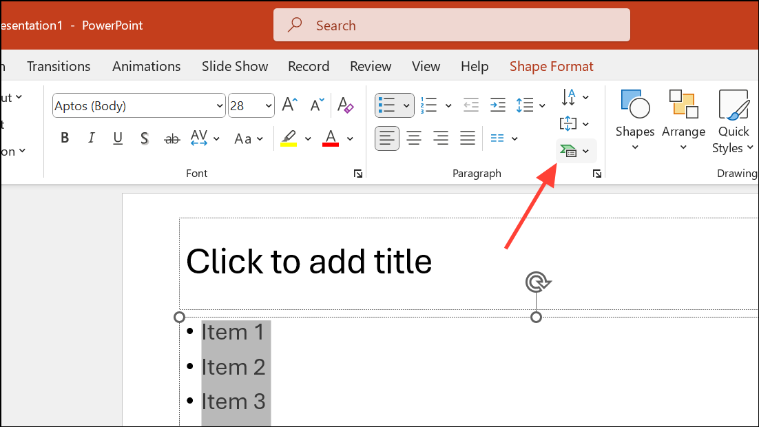 Step 2: Go to the Home tab and click Convert to SmartArt in the Paragraph section.