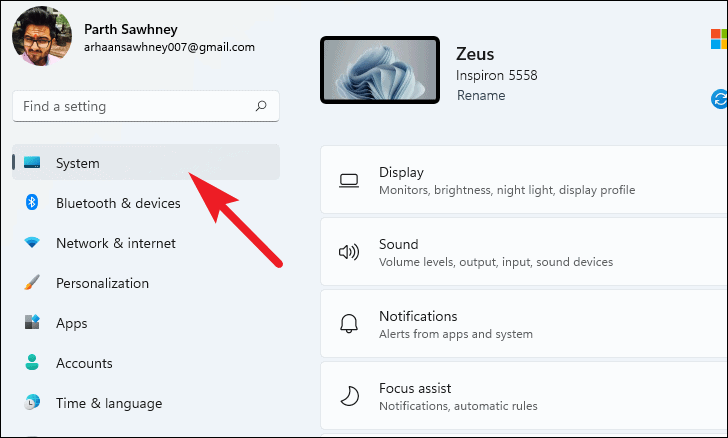 - In the Settings window, select the System tab from the left sidebar.