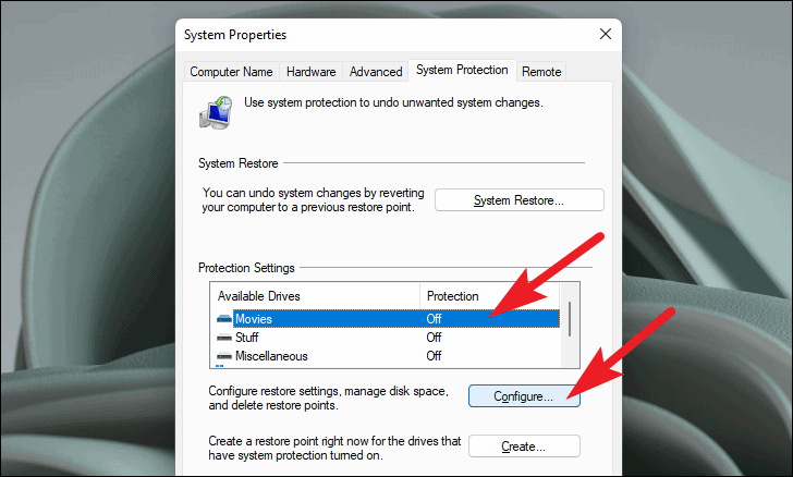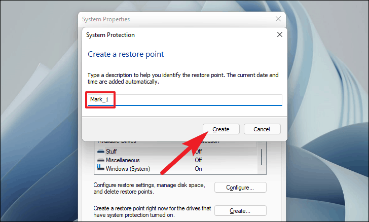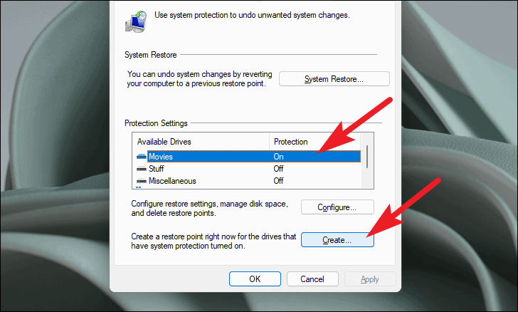 - In the 'System Properties' window, select the drive where you want to create a Restore Point and click on Create.