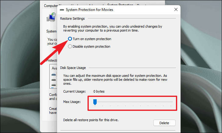 - In the 'System Protection' window, select the option Turn on system protection.