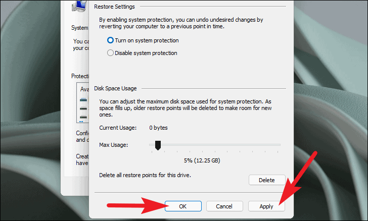 - Adjust the maximum disk space usage for system protection using the slider under 'Disk Space Usage'.