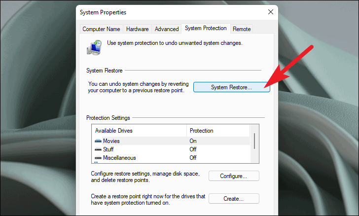 - Open the 'System Properties' window and click on System Restore.