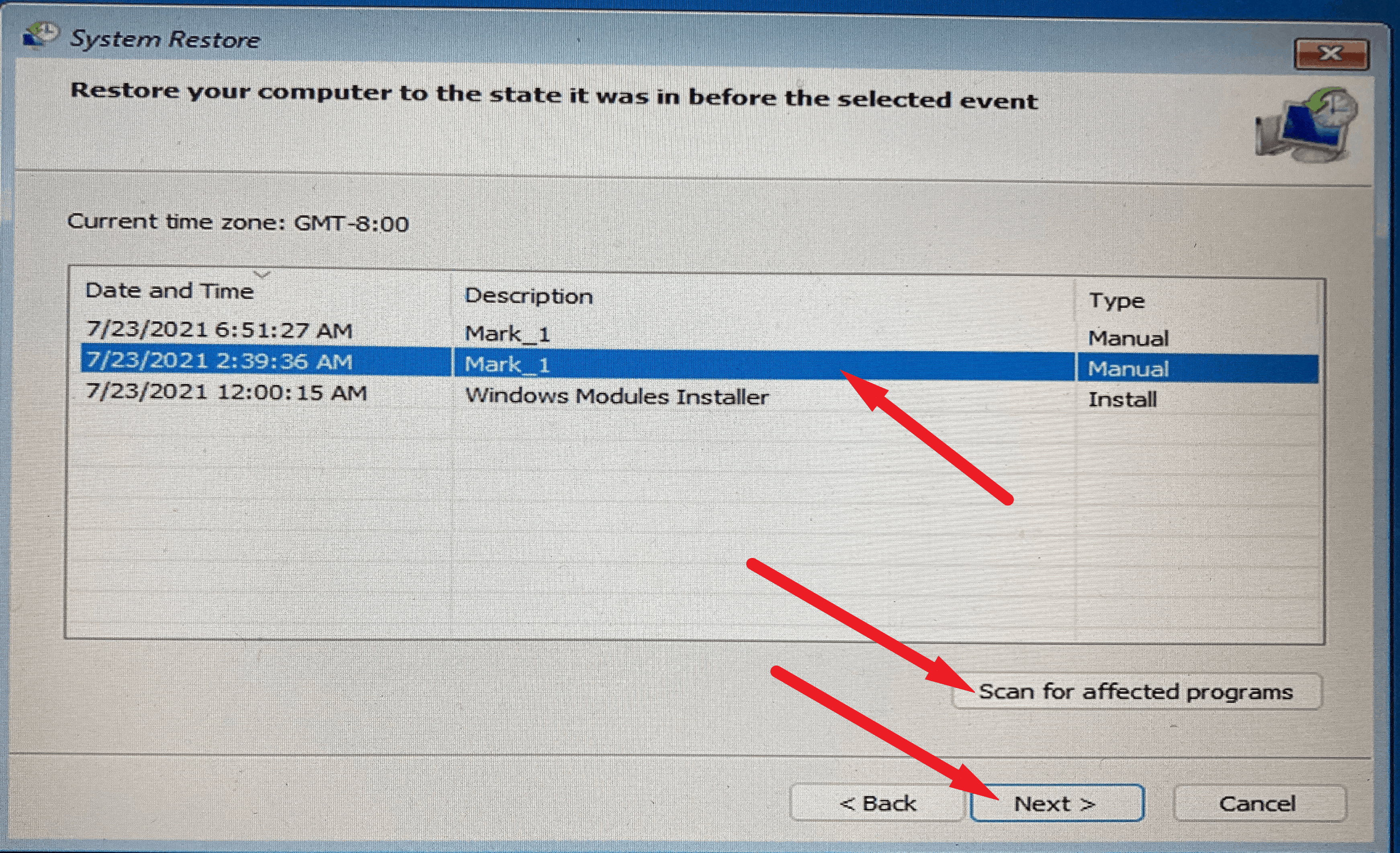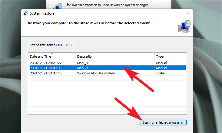 - Select the Restore Point you want to use and click Scan for affected programs to see which programs might be impacted.