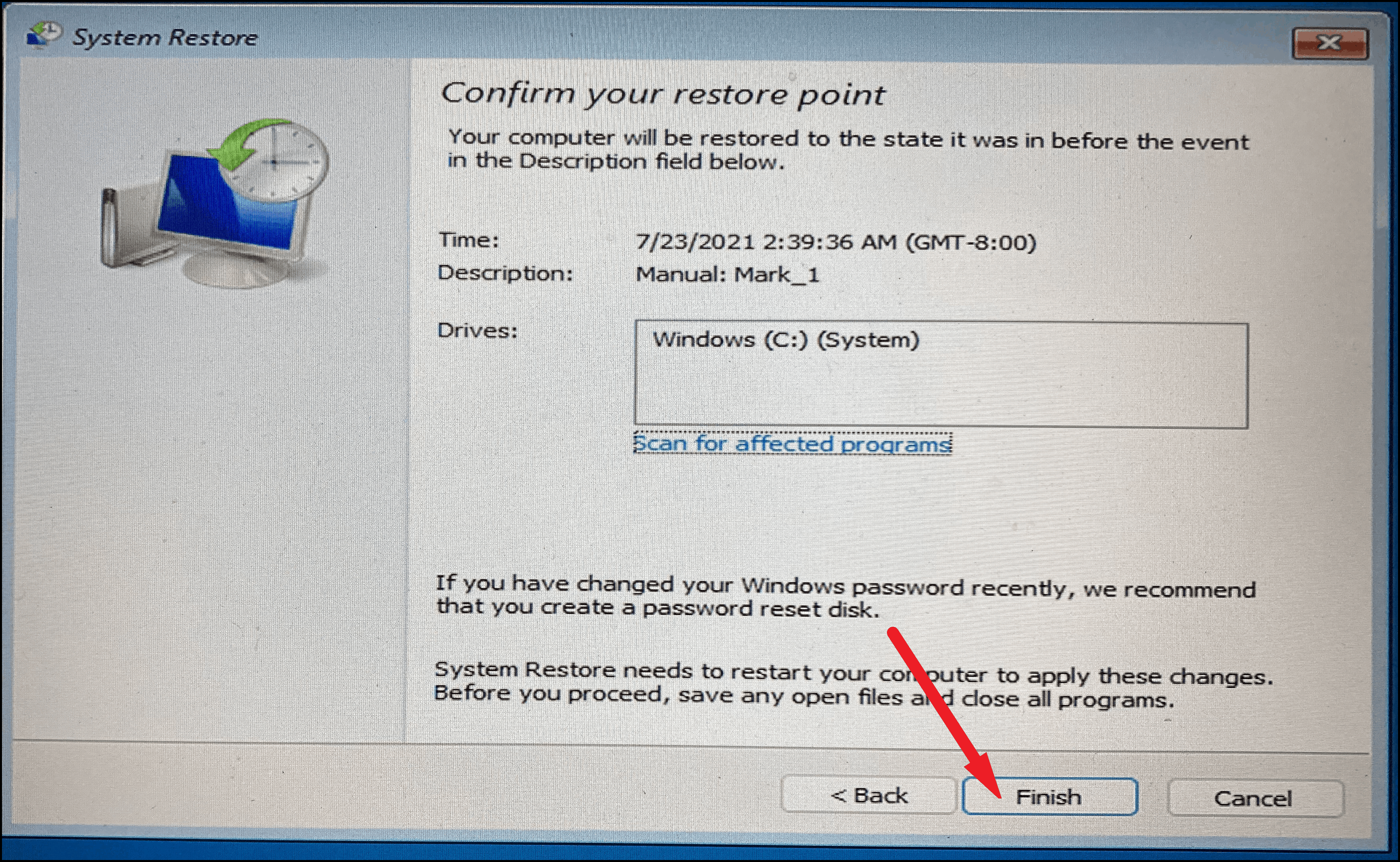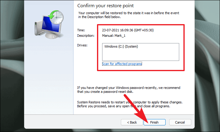 - Confirm the details of the Restore Point and click Finish.