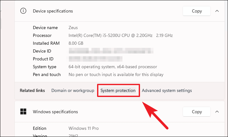 - Under 'Related links', click on System protection.