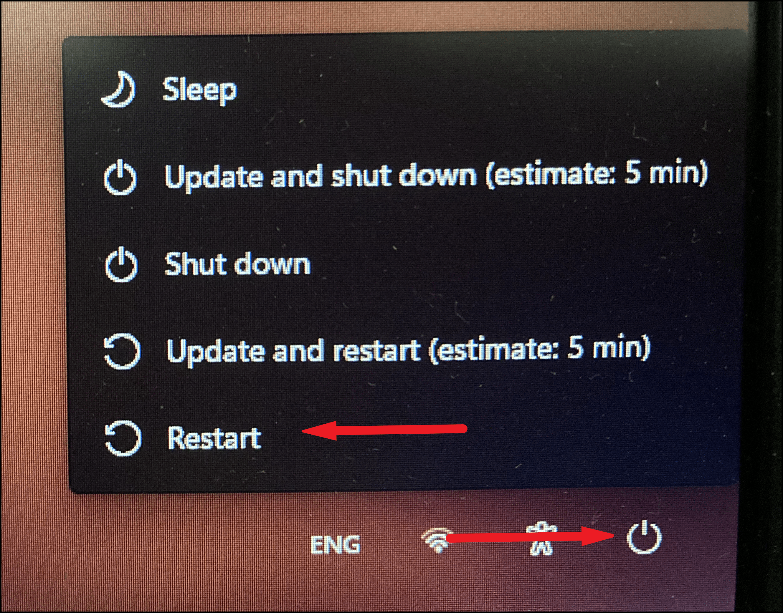 - At the sign-in screen, click the Power icon at the bottom-right corner. Hold the Shift key and select Restart.