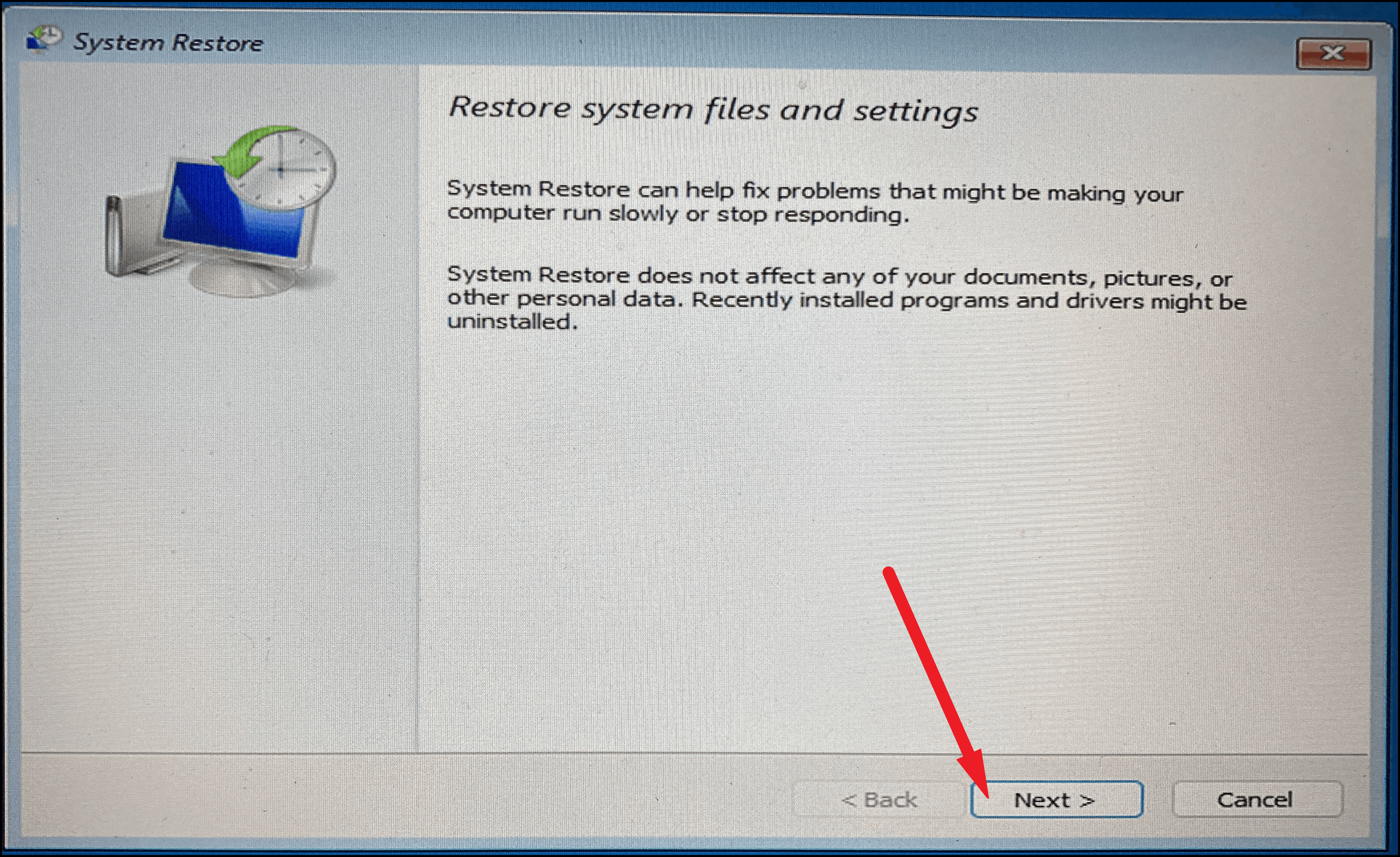 - In the System Restore window, click Next.