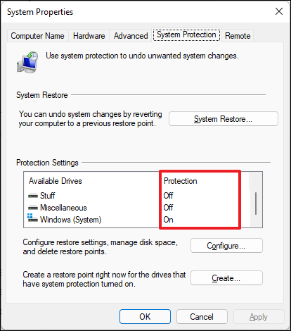 - In the 'System Properties' window, under the Protection Settings section, you'll see a list of available drives and their protection status.