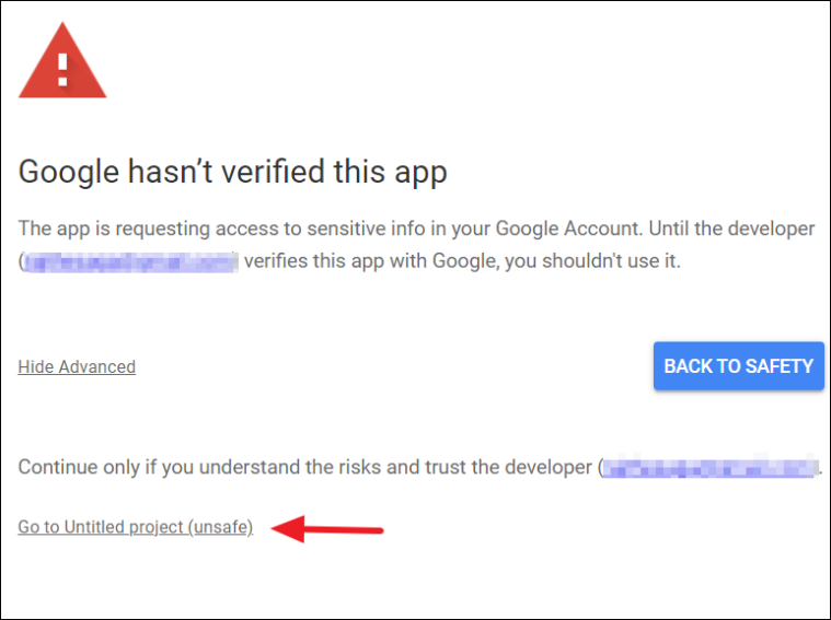A warning message may appear stating that the app isn't verified. Click on Advanced, then select Go to Untitled project (unsafe) or your project's name.